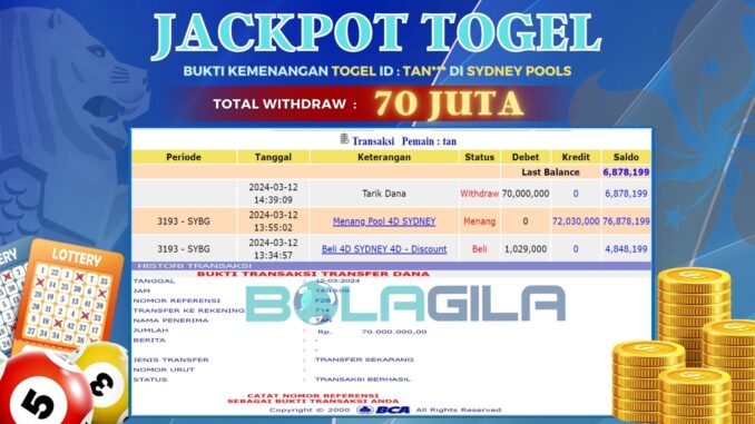 MEMBER BOLAGILA MENERIMA PELUNASAN KEMENANGAN JACKPOT TOGEL DI SYDNEY POOLS Rp 70.000.000,- LUNAS
