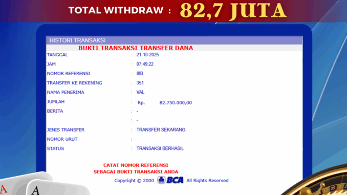 Bukti transfer yang dapat anda lihat adalah bukti SAH / VALID yang langsung di dapatkan melalui bukti transaksi dari Bank yang digunakan untuk pengiriman dana pada rekening pemilik user id. Terima kasih kami sampaikan kepada para pengguna setia BOLAGILA yang telah menggunakan situs kami, sebagai Bandar Terpercaya yang pastinya membayar semua kemenangan member hingga lunas. Apakah BOLAGILA PENIPU ? Reputasi “BOLAGILA TERPERCAYA” sudah sangat melekat.