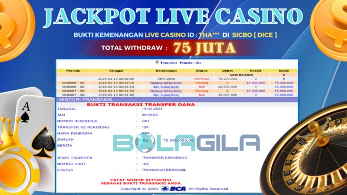 MEMBER BOLAGILA MENERIMA PELUNASAN KEMENANGAN BOLAGILA JACKPOT LIVE CASINO DI SICBO DICE Rp 75,000.000,- LUNAS