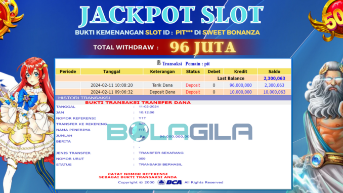 BOLAGILA mengucapkan selamat kepada user id : PIT*** yang telah berhasil mendapatkan jackpot SLOT DI SWEET BONANZA. Kemenangan sebesar Rp 96.000.000,-. telah dibayarkan LUNAS oleh pihak bolagila kepada pemilik user id setelah yang bersangkutan mengisi formulir withdraw. Proses pencairan dana berlangsung sangat cepat hanya dalam waktu 6-11 menit sudah berada dalam rekening pemilik user id.